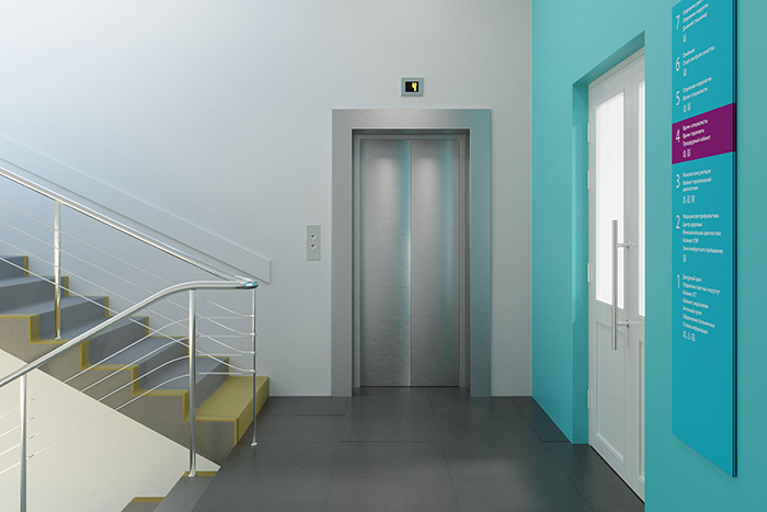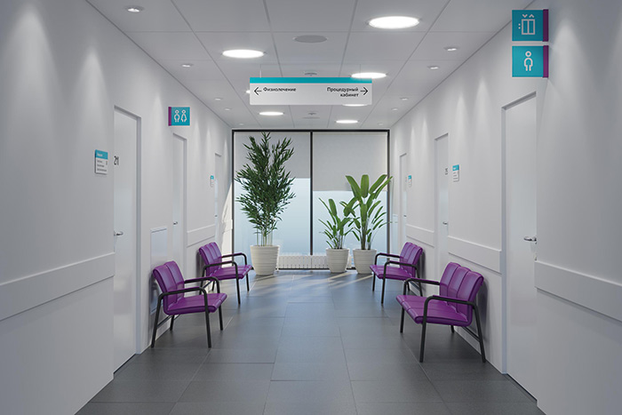 大型顯眼標志垂直懸掛在走廊上:醫(yī)療部門是直的,醫(yī)療中心在右邊。墻支架面板提供了更多細節(jié),并顯示了通往特定對象的方式:辦公室,手術(shù)室,電梯或洗手間。尋路標志在地板上毫不擾動地重復(fù):瓷磚上貼有帶有房間編號和箭頭范圍的淺色貼紙。
