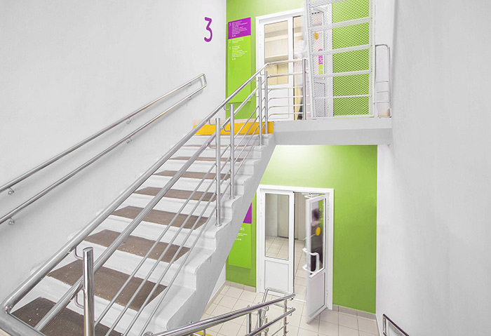 那些想爬樓梯而伸展的人可以使用帶有易于識別符號的支架板,使他們立即清楚地知道要去哪里。每層樓梯的出口都標有較大的樓層號。