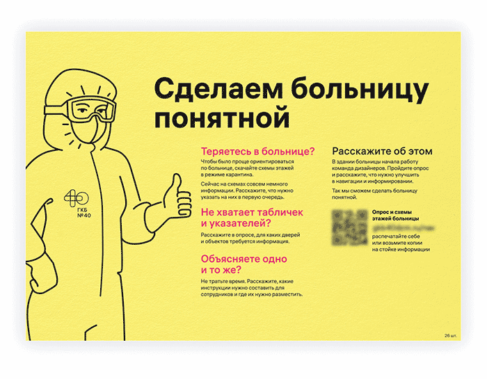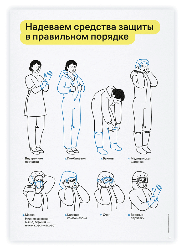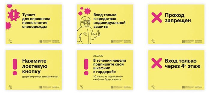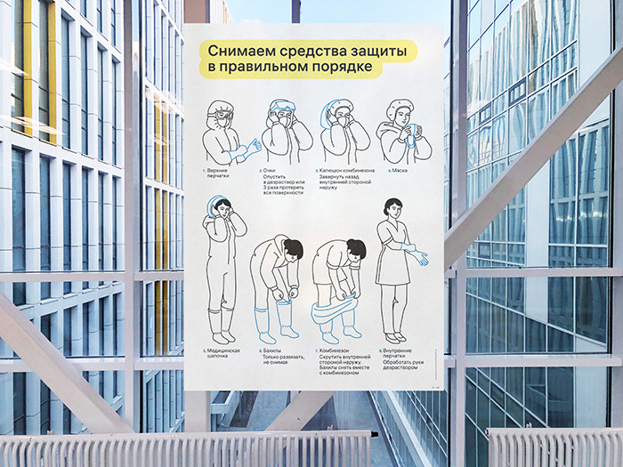 為Kommunarka醫(yī)院的尋路系統(tǒng)創(chuàng)建了大型指導(dǎo)性海報。圖片顯示了在隔離區(qū)工作時穿戴和卸下個人防護設(shè)備的順序。插圖在防護眼鏡中很容易看到,很漂亮,最重要的是,即使在快速變化的情況下快速看了一眼,它們也清晰可見。