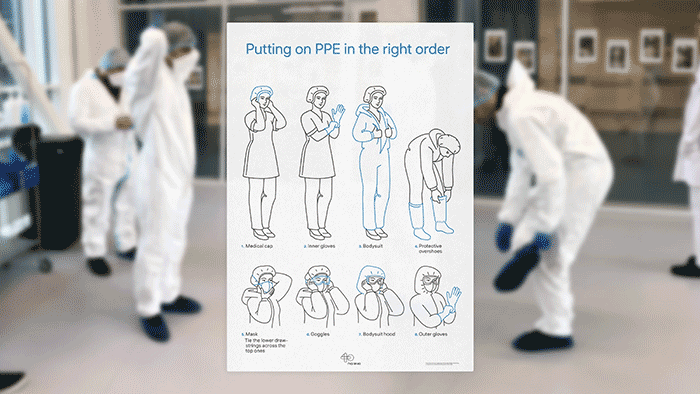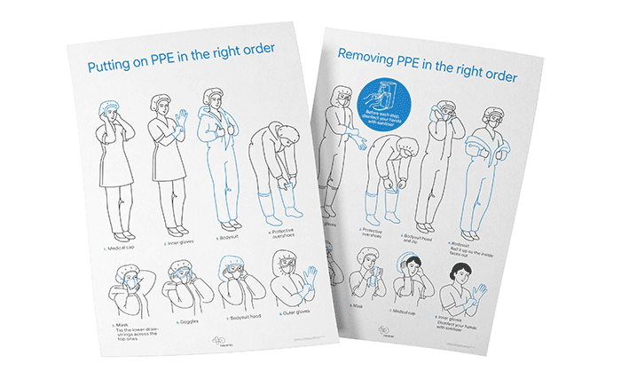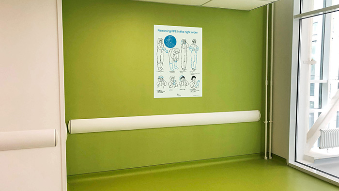 特別注意有關(guān)穿上和卸下個人保護設(shè)備的分步說明。進入隔離區(qū)的每個人都使用說明。海報設(shè)計和插圖很大,因此即使在戴防護眼鏡時也可以從遠處清晰地看到它們。