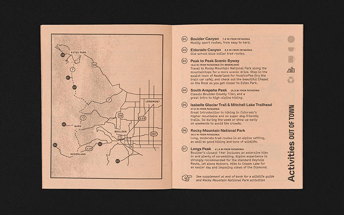 廣州logo設(shè)計(jì)公司認(rèn)為畫冊(cè)包裝設(shè)計(jì)中包含的大部分建議是由Patagonia Boulder工作人員提出的。我們通過創(chuàng)建貫穿整本書的“補(bǔ)充信息”,增加了一些有用的細(xì)節(jié),個(gè)性,幽默感和一些自欺欺人的內(nèi)容,從而在內(nèi)容上大放異彩。品牌VI設(shè)計(jì)公司用于小畫冊(cè)子的未涂布紙漿(法國(guó)造紙公司的Kraft-Tone)具有出色的環(huán)境信用,同時(shí)還具有獨(dú)特的質(zhì)感,可以反映出Patagonia和Boulder共享的自然,戶外氛圍。