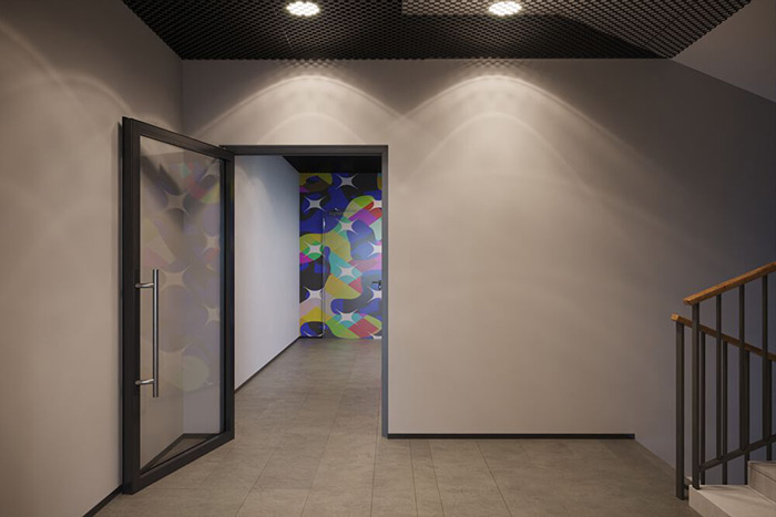 外部前廳允許創(chuàng)建一個(gè)帶有品牌墻的成熟接待區(qū)。右邊狹窄的柜子里藏著電器、儀表和其他難看的設(shè)備。櫥柜的開(kāi)放式壁龕可以存放文件文件夾或迷人的花盆。