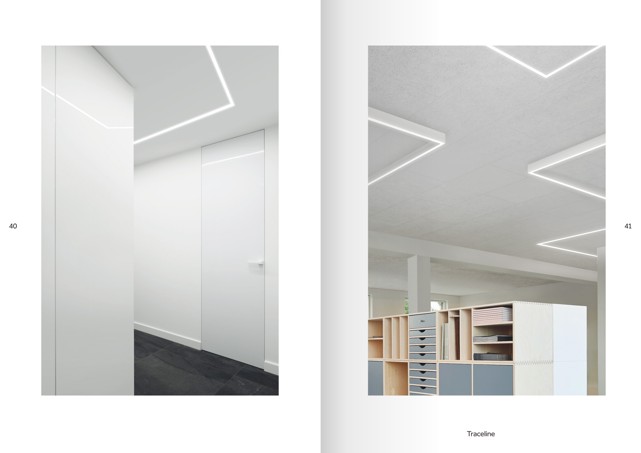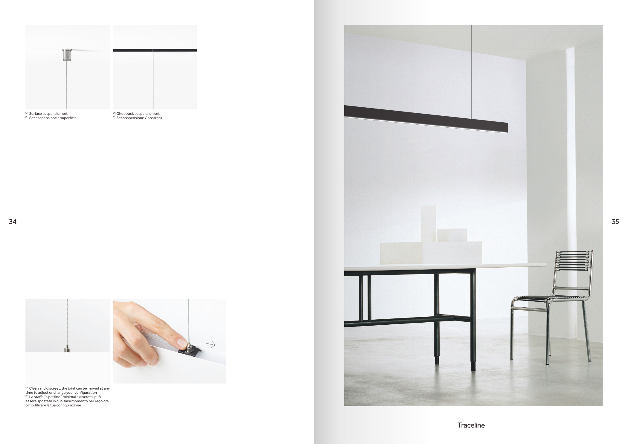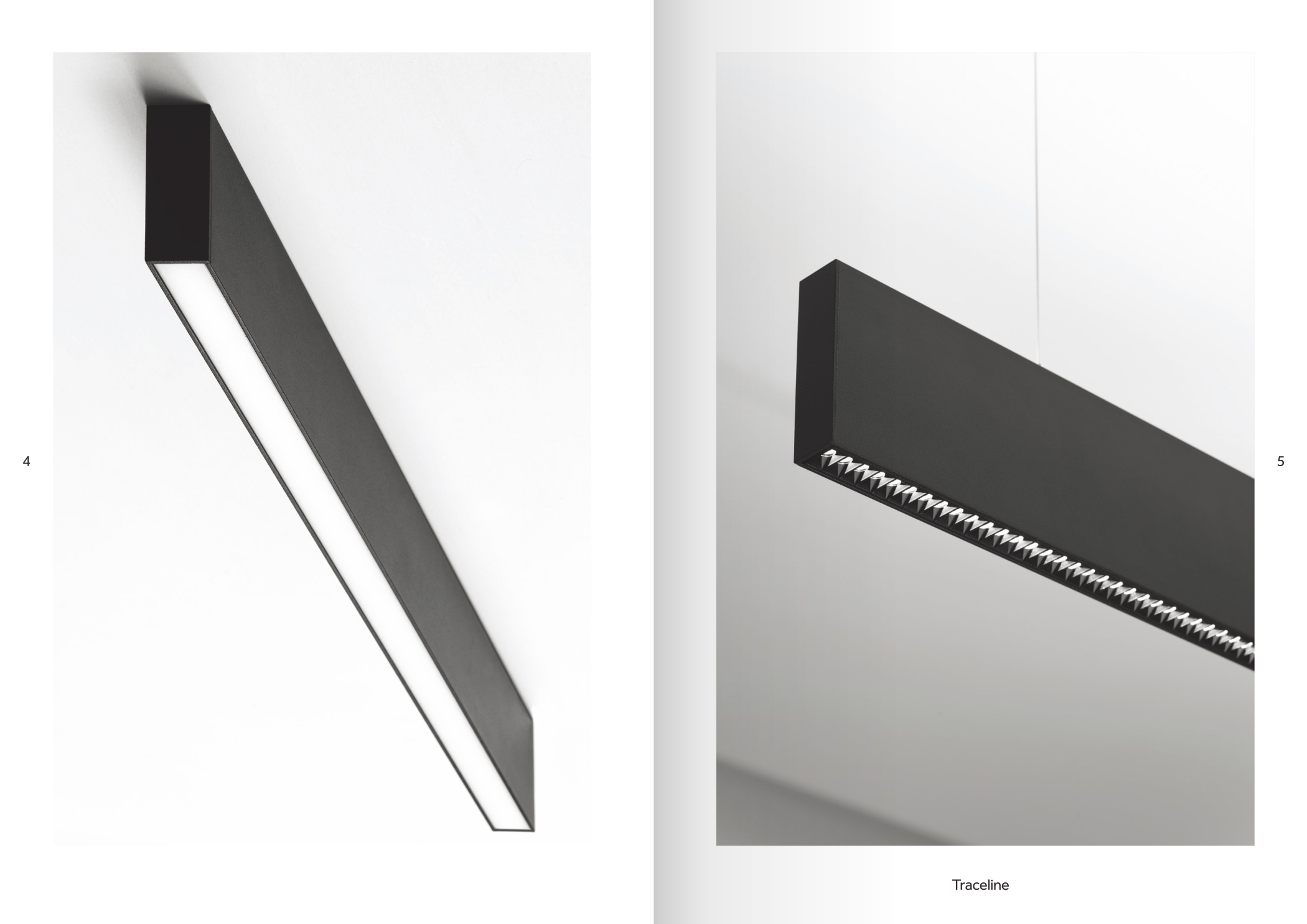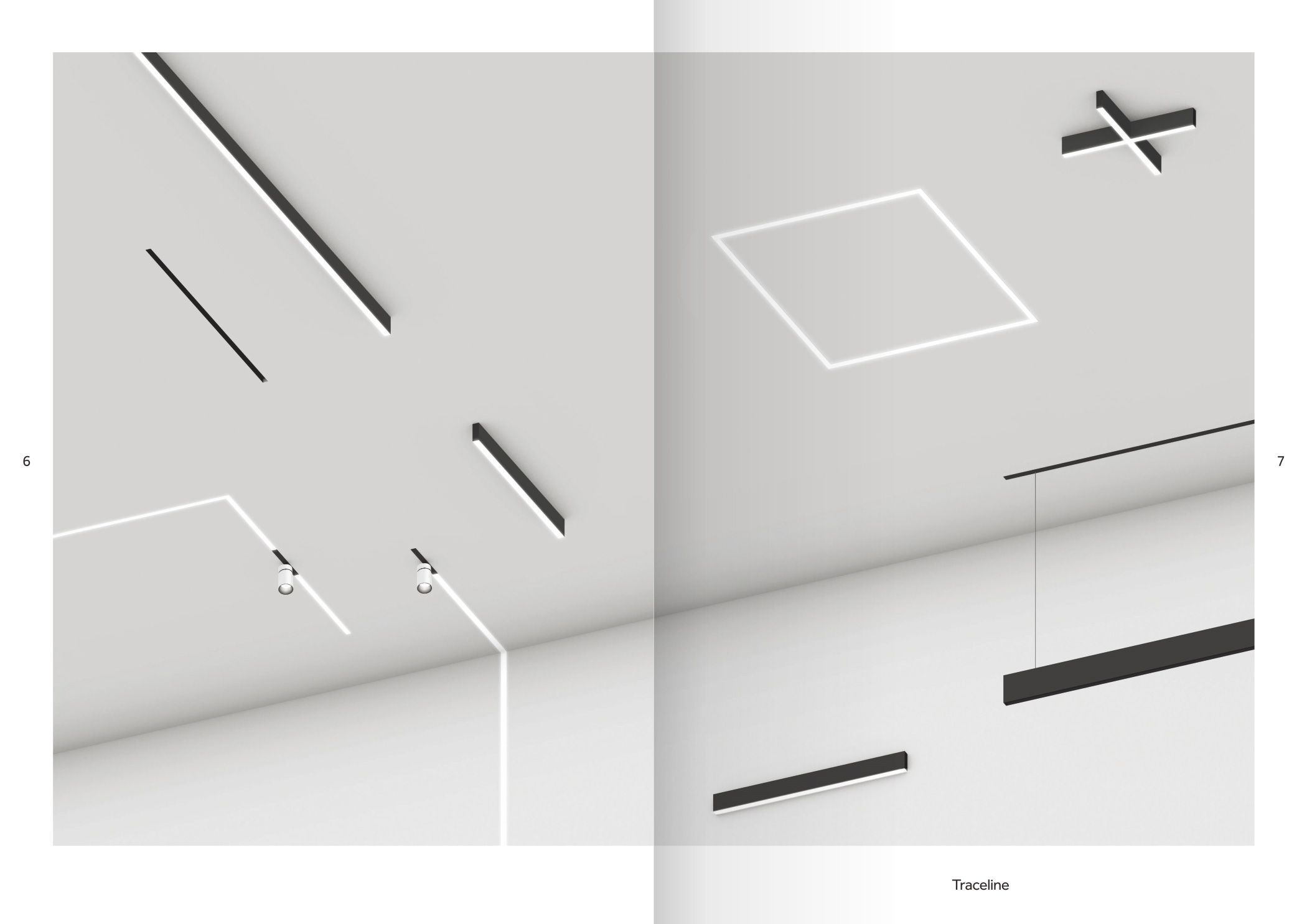 品牌設計手冊貫以Bring the lines to the forefront為核心概念,用極簡而冷峻的黑白灰主調配合局部高飽和橙色作焦點,把線性光本身變成視覺語言,封面大幅留白僅留一條1mm細線貫穿,暗示Traceline系統(tǒng)無限延伸的特質;內頁延續(xù)這一母題,用10mm通欄黑線作為章節(jié)索引,既呼應產品“連續(xù)線”賣點,也充當導航條,讀者翻動時黑線始終保持同一位置,形成物理層面的“光軌”體驗。版面采用8欄網格,文字與圖片交替嵌入,產品攝影全部去底并壓入5%灰背景,使燈具如同懸浮在空間中;對角線裁切的大圖與90°方形技術圖并置,象征“Anglesandsquares”光學配件的靈活組合。色彩體系只用PantoneBlack6C、CoolGray9C與品牌Orange021C,橙色專色僅限頁碼、關鍵數(shù)據(jù)與交互按鈕,確保任何一翻開頁即可捕捉核心參數(shù)。字體選用NeueHaasGrotesk與思源黑體混排,英文字體極細字重對應線性光,中文字體中等字重保證可讀性,二者通過8pt字號的微縮排布,把技術表格壓縮成“隱形”信息層,需借放大鏡或手機微距才能閱讀,隱喻Traceline無線控制“藏在光里”的科技屬性。裝訂采用裸背鎖線加180°平攤工藝,使1:1比例的3000mm長燈槽可以完整展開,閱讀者能直接把畫冊放在地面,與真實燈槽比對長度;封面覆以超啞光膜并在黑線處做局部UV凸起,手指劃過即可感知光的軌跡。整本畫冊沒有一處多余裝飾,所有圖形、留白、裁切都與Traceline的“無限延伸、無縫拼接、隱形控制”三大賣點一一對應,最終讓“線性照明”這一抽象概念變成可觸摸、可翻閱、可記憶的實體體驗。