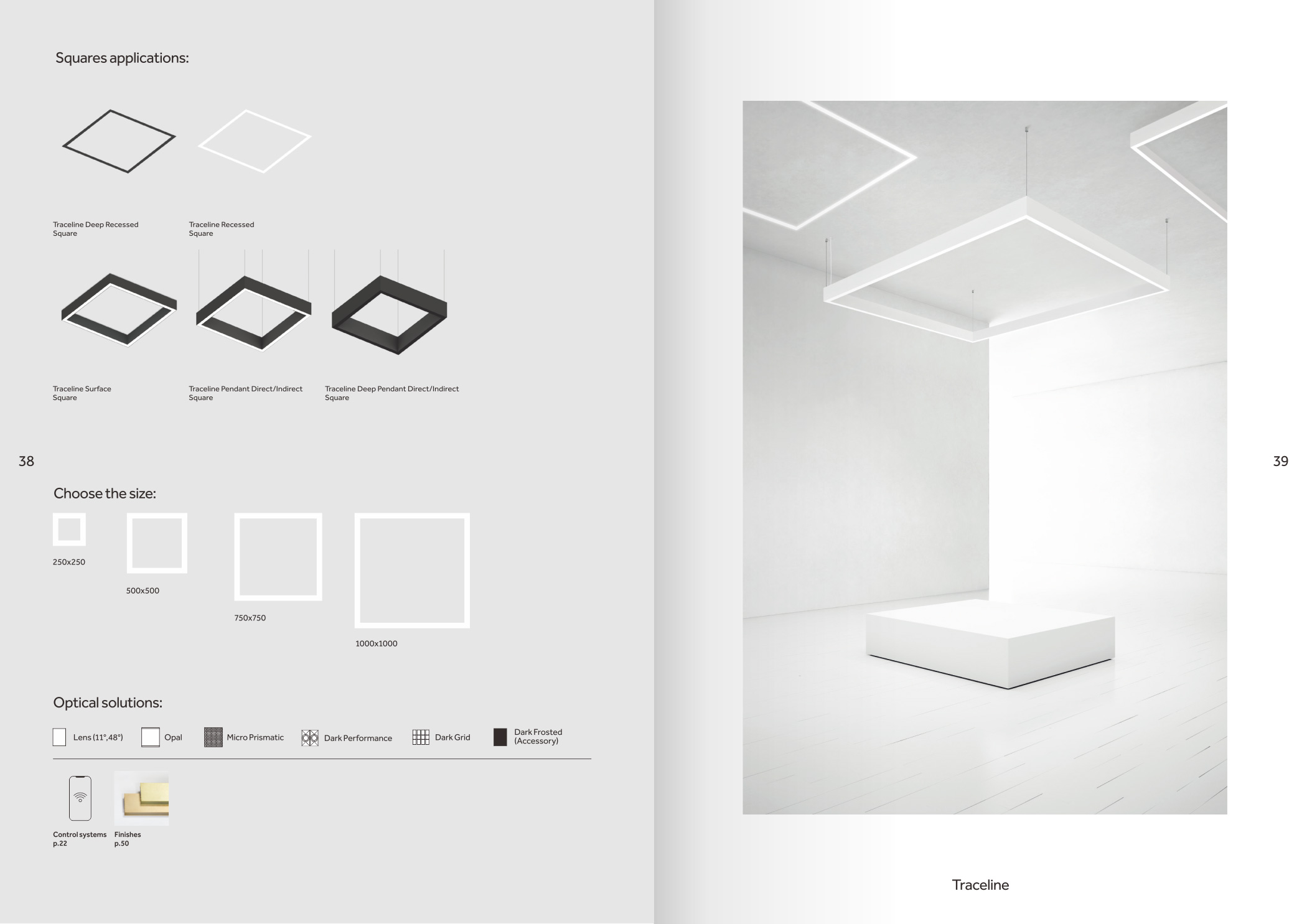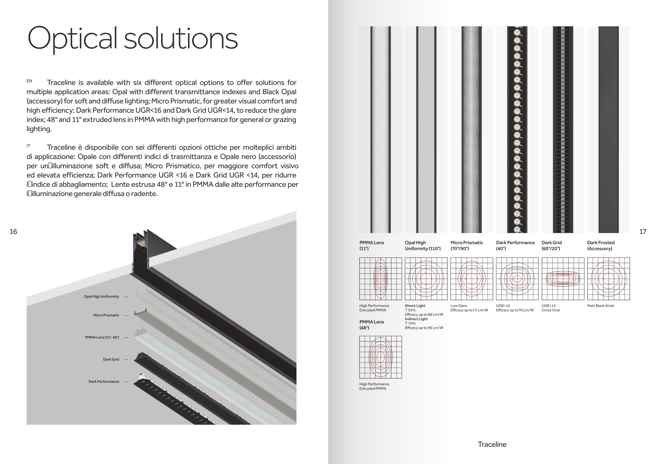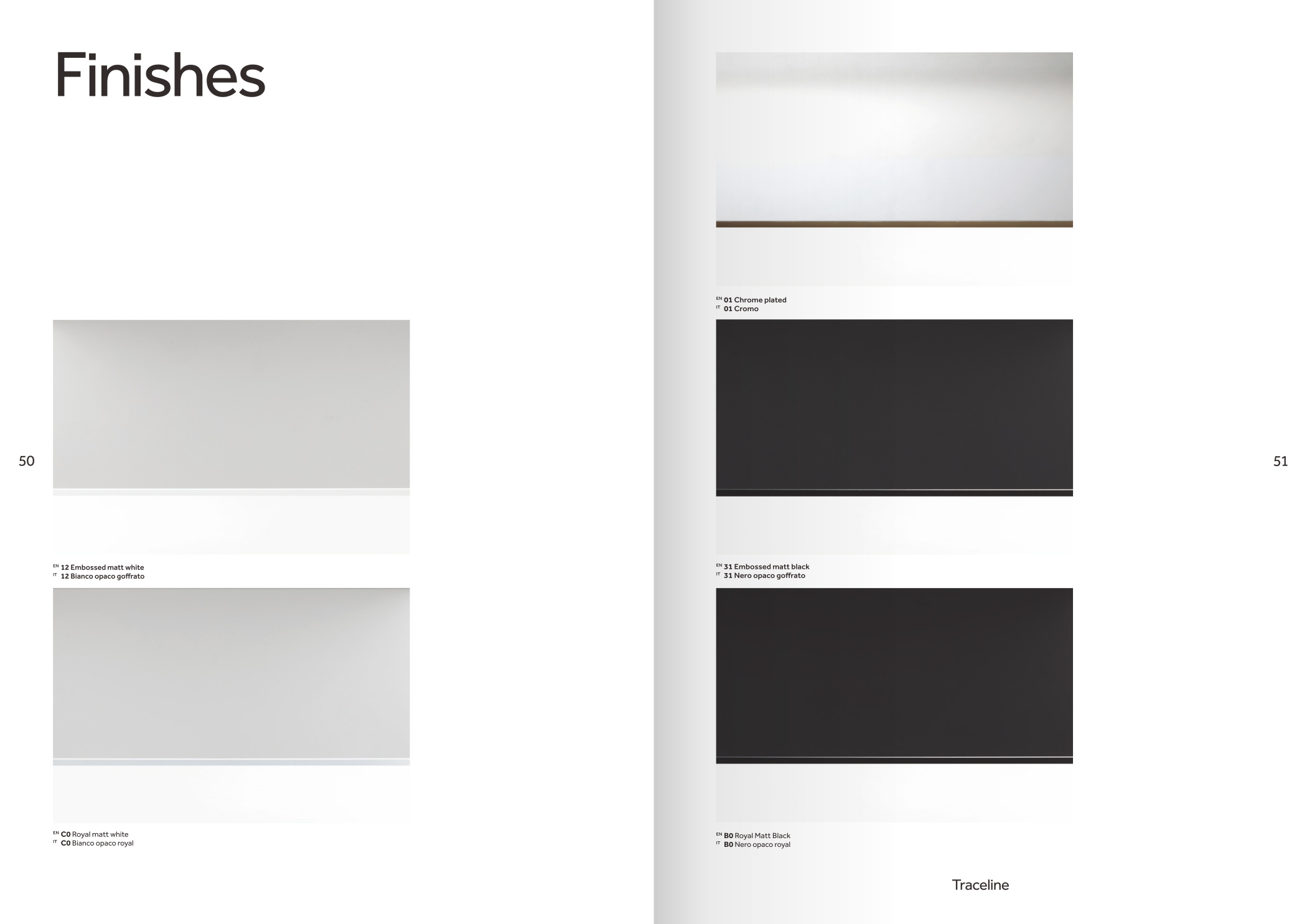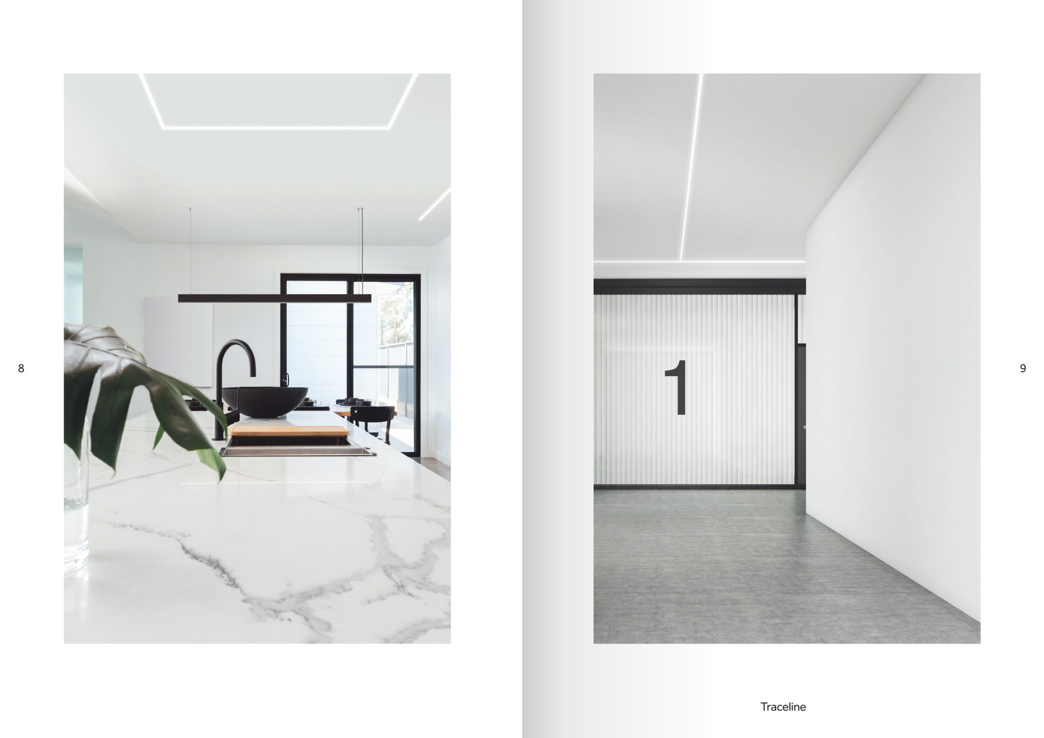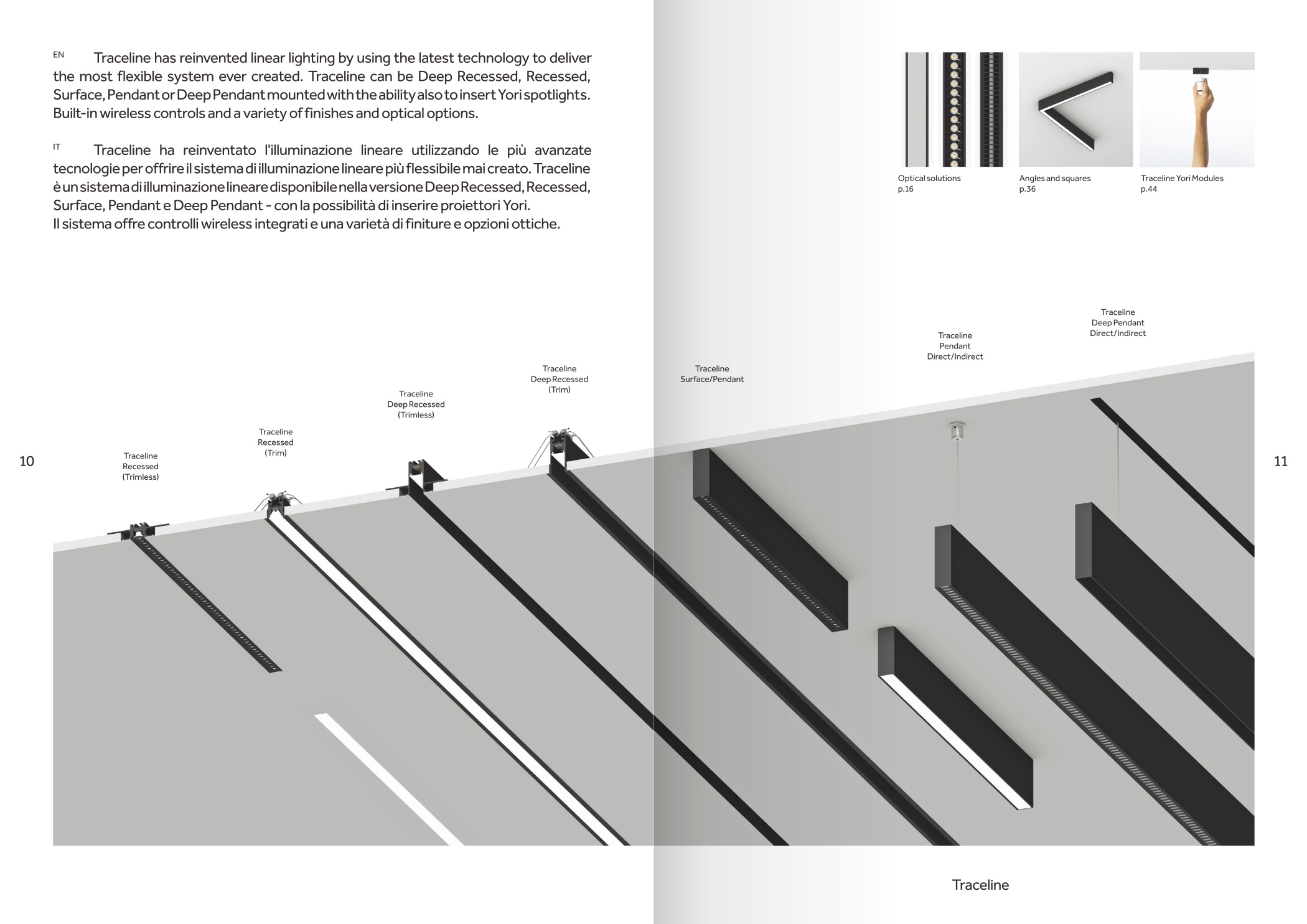 品牌設計手冊貫以Bring the lines to the forefront為核心概念,用極簡而冷峻的黑白灰主調配合局部高飽和橙色作焦點,把線性光本身變成視覺語言,封面大幅留白僅留一條1mm細線貫穿,暗示Traceline系統(tǒng)無限延伸的特質;內頁延續(xù)這一母題,用10mm通欄黑線作為章節(jié)索引,既呼應產品“連續(xù)線”賣點,也充當導航條,讀者翻動時黑線始終保持同一位置,形成物理層面的“光軌”體驗。版面采用8欄網格,文字與圖片交替嵌入,產品攝影全部去底并壓入5%灰背景,使燈具如同懸浮在空間中;對角線裁切的大圖與90°方形技術圖并置,象征“Anglesandsquares”光學配件的靈活組合。色彩體系只用PantoneBlack6C、CoolGray9C與品牌Orange021C,橙色專色僅限頁碼、關鍵數(shù)據(jù)與交互按鈕,確保任何一翻開頁即可捕捉核心參數(shù)。字體選用NeueHaasGrotesk與思源黑體混排,英文字體極細字重對應線性光,中文字體中等字重保證可讀性,二者通過8pt字號的微縮排布,把技術表格壓縮成“隱形”信息層,需借放大鏡或手機微距才能閱讀,隱喻Traceline無線控制“藏在光里”的科技屬性。裝訂采用裸背鎖線加180°平攤工藝,使1:1比例的3000mm長燈槽可以完整展開,閱讀者能直接把畫冊放在地面,與真實燈槽比對長度;封面覆以超啞光膜并在黑線處做局部UV凸起,手指劃過即可感知光的軌跡。整本畫冊沒有一處多余裝飾,所有圖形、留白、裁切都與Traceline的“無限延伸、無縫拼接、隱形控制”三大賣點一一對應,最終讓“線性照明”這一抽象概念變成可觸摸、可翻閱、可記憶的實體體驗。