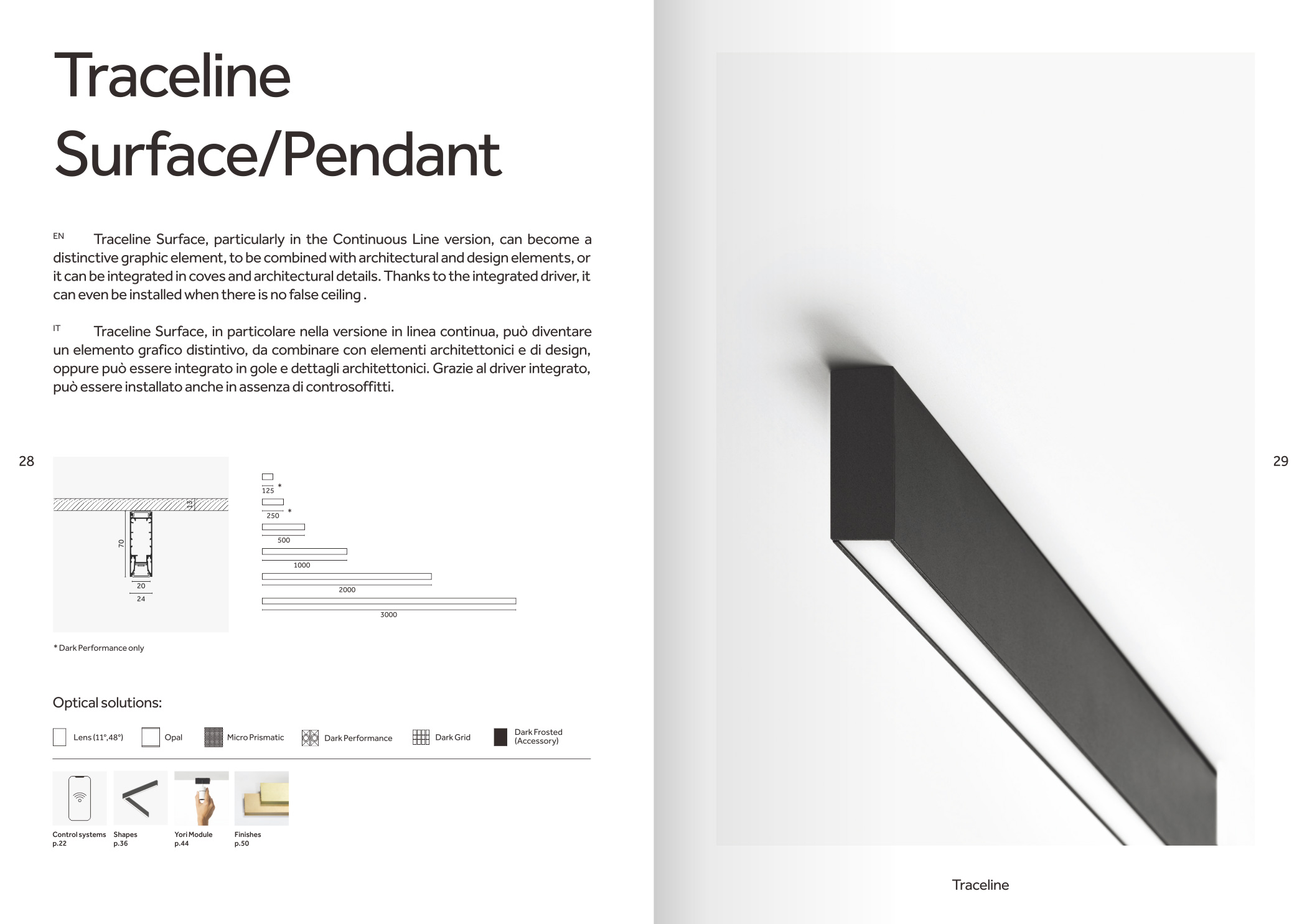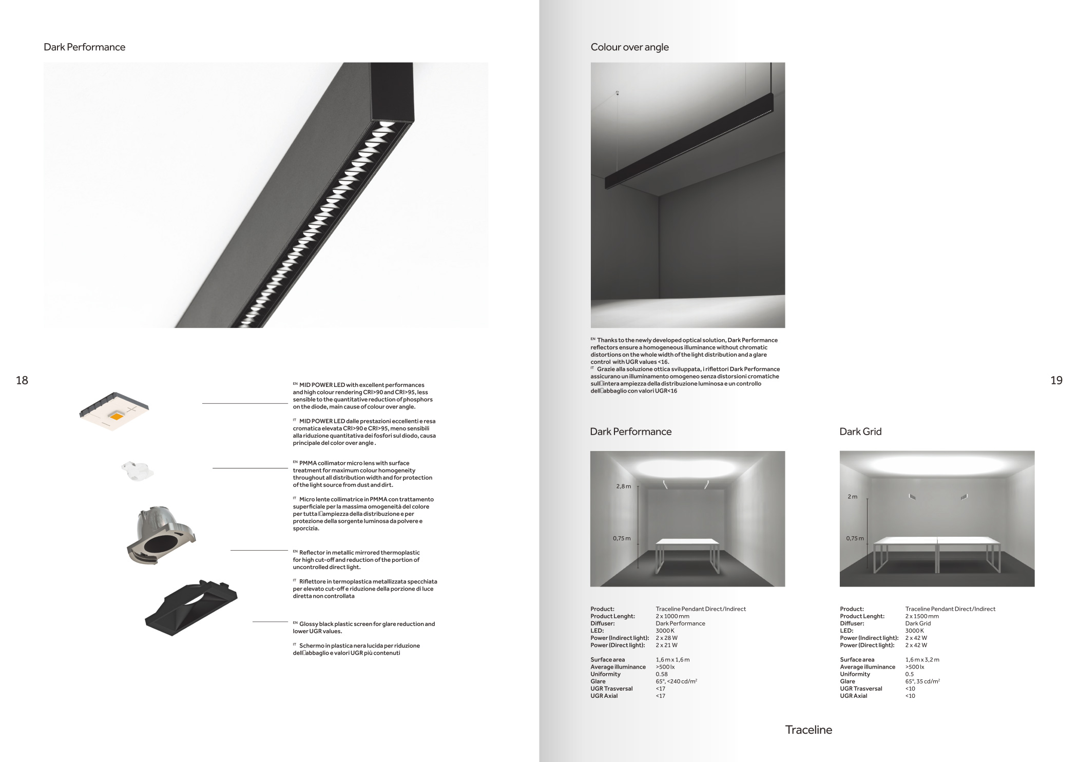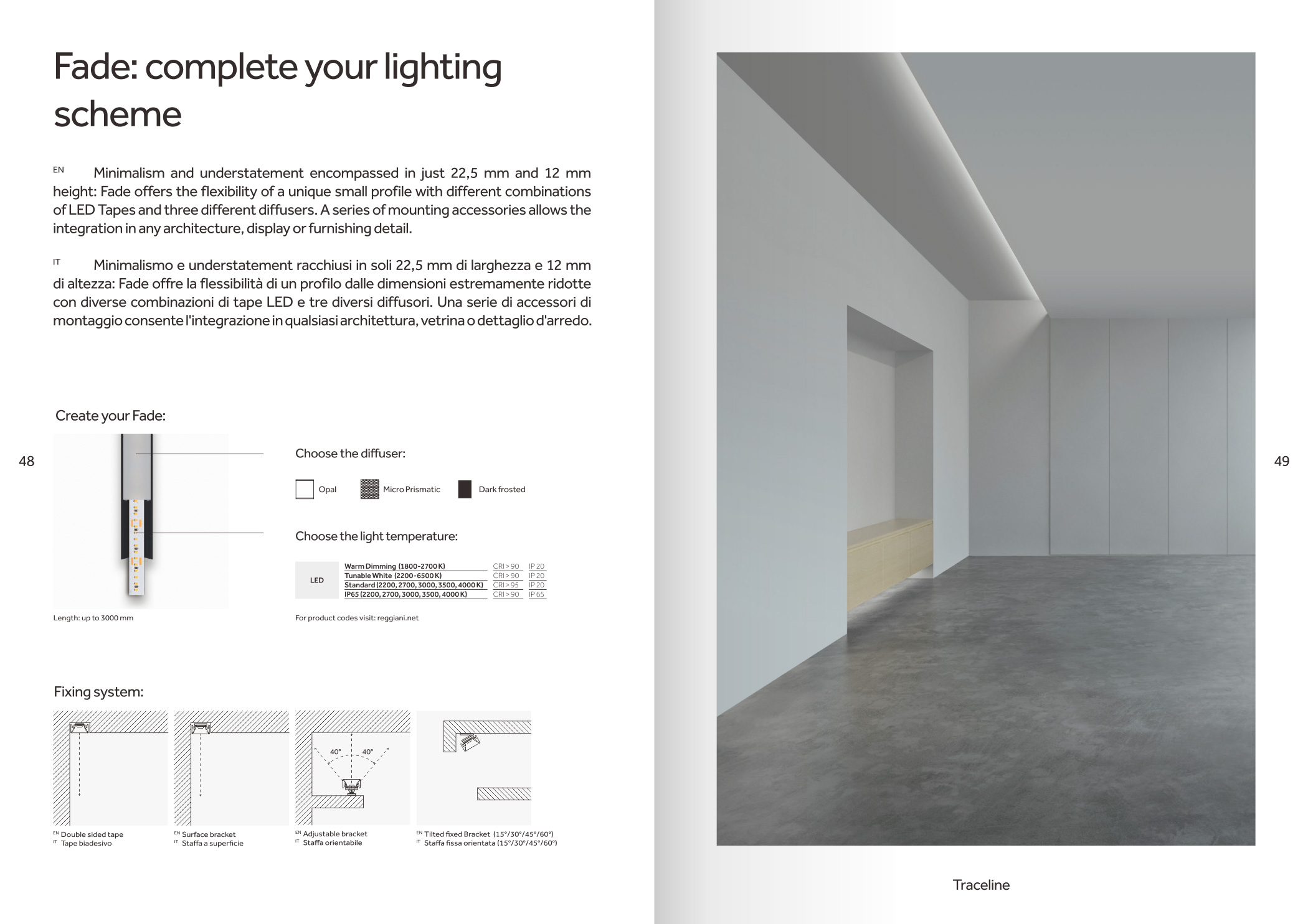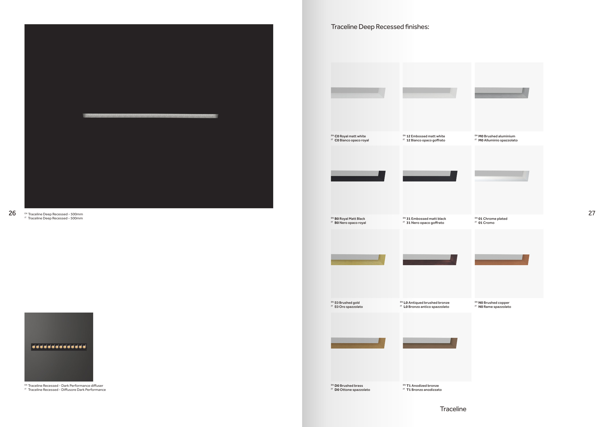 品牌設計手冊貫以Bring the lines to the forefront為核心概念,用極簡而冷峻的黑白灰主調配合局部高飽和橙色作焦點,把線性光本身變成視覺語言,封面大幅留白僅留一條1mm細線貫穿,暗示Traceline系統(tǒng)無限延伸的特質;內頁延續(xù)這一母題,用10mm通欄黑線作為章節(jié)索引,既呼應產品“連續(xù)線”賣點,也充當導航條,讀者翻動時黑線始終保持同一位置,形成物理層面的“光軌”體驗。版面采用8欄網格,文字與圖片交替嵌入,產品攝影全部去底并壓入5%灰背景,使燈具如同懸浮在空間中;對角線裁切的大圖與90°方形技術圖并置,象征“Anglesandsquares”光學配件的靈活組合。色彩體系只用PantoneBlack6C、CoolGray9C與品牌Orange021C,橙色專色僅限頁碼、關鍵數(shù)據(jù)與交互按鈕,確保任何一翻開頁即可捕捉核心參數(shù)。字體選用NeueHaasGrotesk與思源黑體混排,英文字體極細字重對應線性光,中文字體中等字重保證可讀性,二者通過8pt字號的微縮排布,把技術表格壓縮成“隱形”信息層,需借放大鏡或手機微距才能閱讀,隱喻Traceline無線控制“藏在光里”的科技屬性。裝訂采用裸背鎖線加180°平攤工藝,使1:1比例的3000mm長燈槽可以完整展開,閱讀者能直接把畫冊放在地面,與真實燈槽比對長度;封面覆以超啞光膜并在黑線處做局部UV凸起,手指劃過即可感知光的軌跡。整本畫冊沒有一處多余裝飾,所有圖形、留白、裁切都與Traceline的“無限延伸、無縫拼接、隱形控制”三大賣點一一對應,最終讓“線性照明”這一抽象概念變成可觸摸、可翻閱、可記憶的實體體驗。