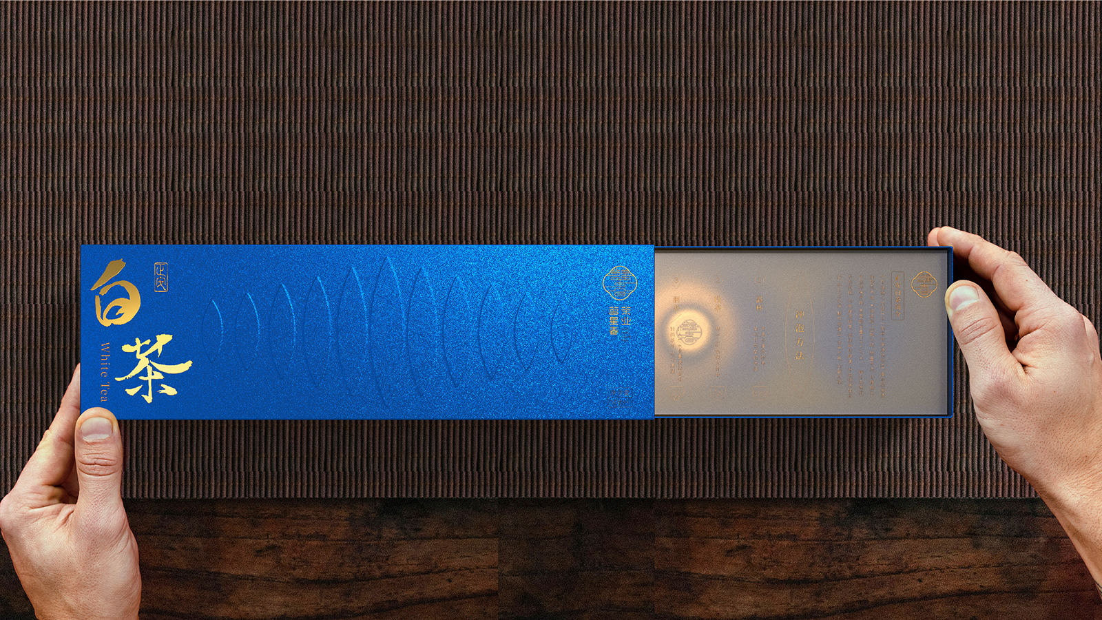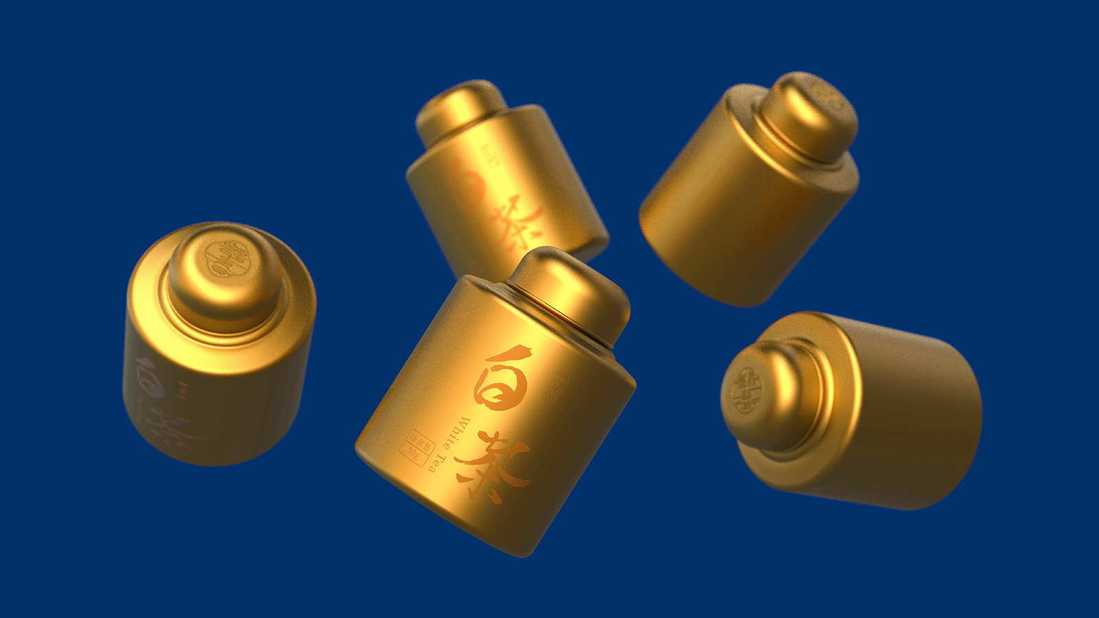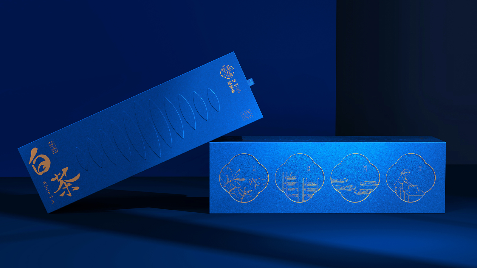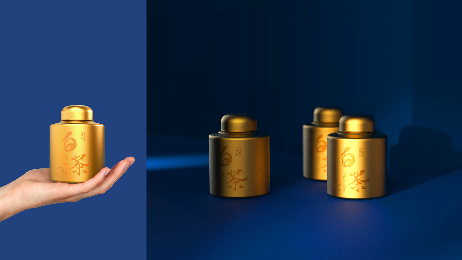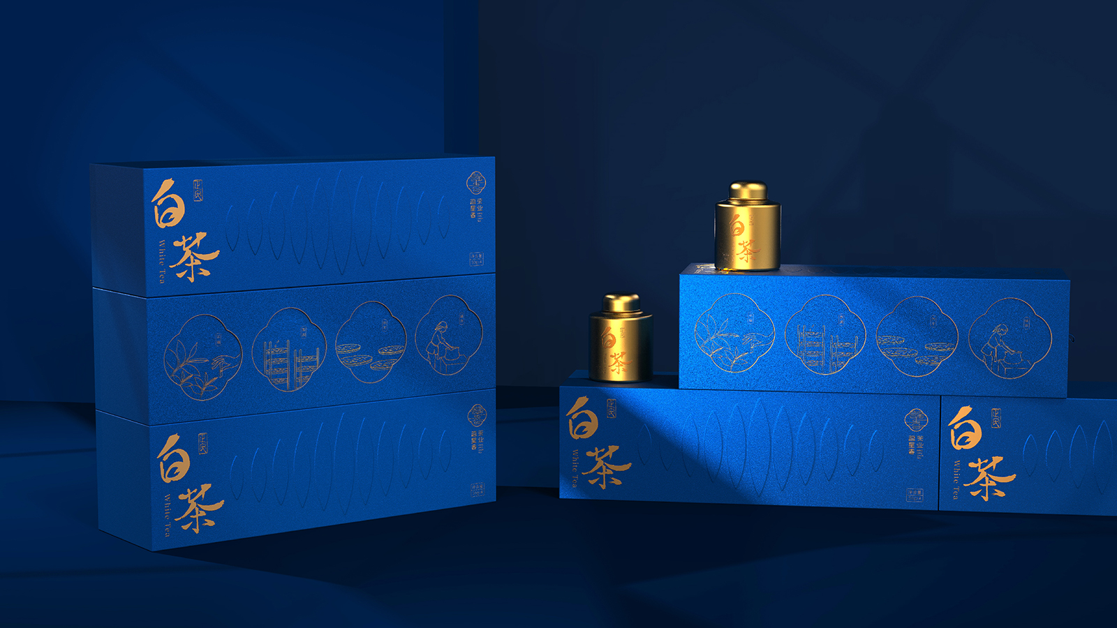 白茶文化的內(nèi)涵遠不止于其表面的裝飾性,白茶的包裝設計既要有傳統(tǒng)韻味,又需符合現(xiàn)代審美需求的茶葉包裝。希望包裝都能成為一場視覺與文化的盛宴,讓消費者在品茶之余,也能感受到茶文化的深遠影響。在設計中我們將中國傳統(tǒng)茶文化的精髓與現(xiàn)代理念相結(jié)合。選取了藍色和金色作為主色調(diào),分別代表著茶葉的生機、寧靜與熱情體現(xiàn)了茶葉品質(zhì)的自然屬性,也滿足了消費者對美的追求。金色材質(zhì)的茶葉罐與藍色相搭配增添了包裝的質(zhì)感和層次感。
