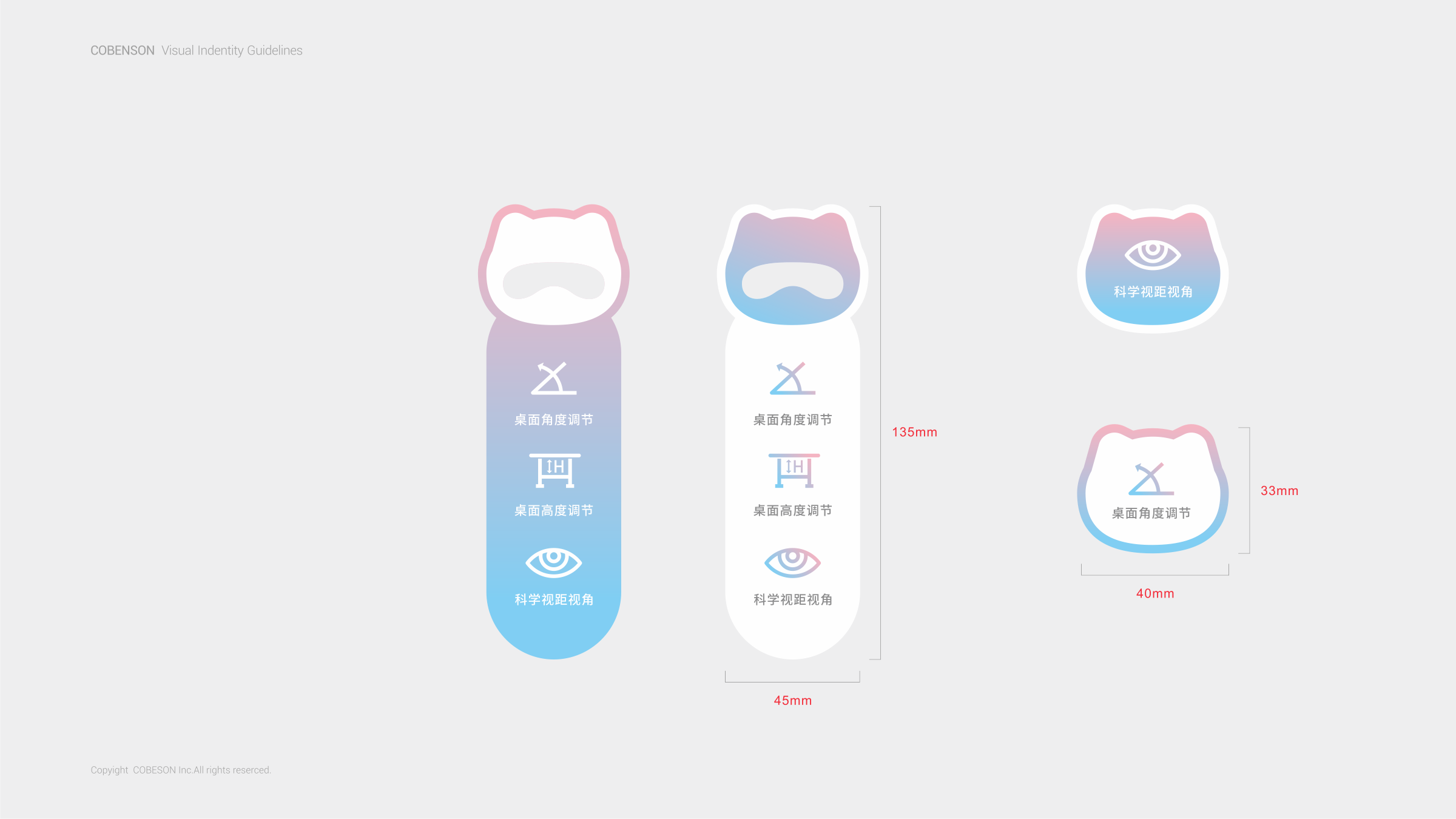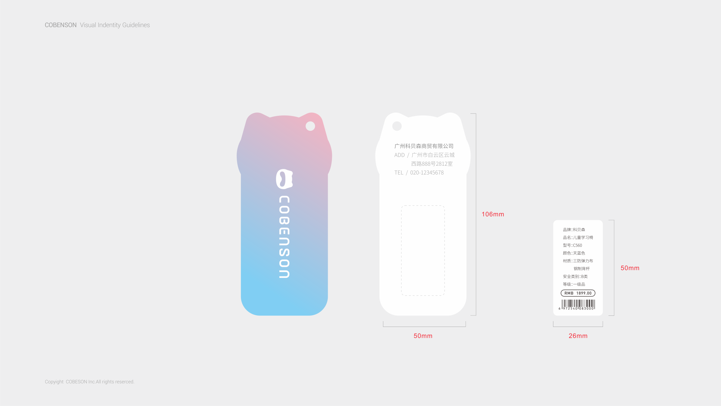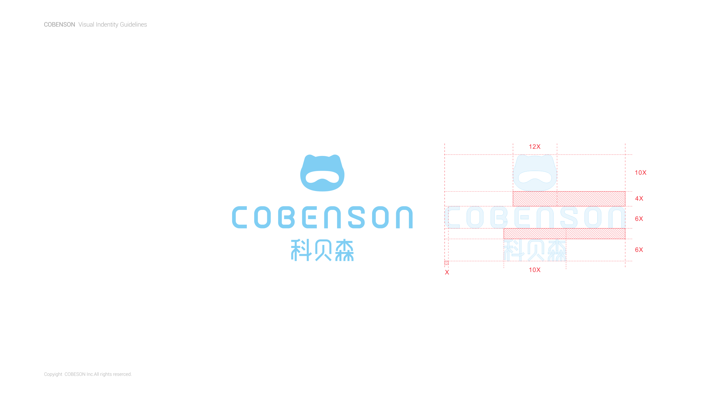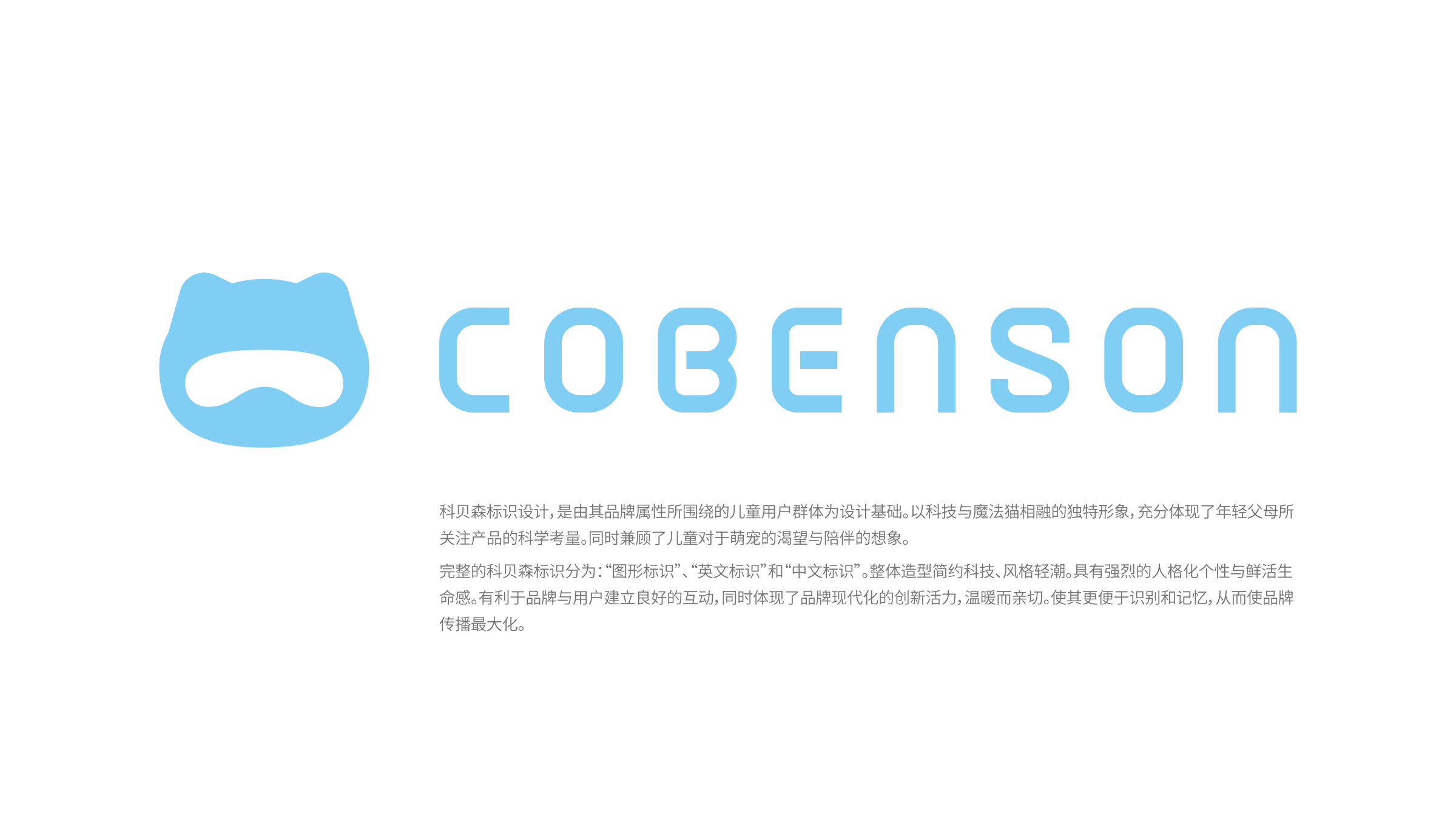 COBENSON科貝森標(biāo)志設(shè)計(jì),是由其品牌屬性所圍繞的兒童用戶群體為設(shè)計(jì)基礎(chǔ)。以科技與魔法貓相融的獨(dú)特形象,充分體現(xiàn)了年輕父母所關(guān)注產(chǎn)品的科學(xué)考量。同時(shí)兼顧了兒童對(duì)于萌寵的渴望與陪伴的想象。完整的COBENSON科貝森標(biāo)識(shí)分為:“圖形標(biāo)識(shí)”、“英文標(biāo)識(shí)”和“中文標(biāo)識(shí)”。整體造型簡(jiǎn)約科技、風(fēng)格輕潮。具有強(qiáng)烈的人格化個(gè)性與鮮活生命感。有利于品牌與用戶建立良好的互動(dòng),同時(shí)體現(xiàn)了品牌現(xiàn)代化的創(chuàng)新活力,溫暖而親切。使其更便于識(shí)別別和記憶,從而使品牌傳播最大化。